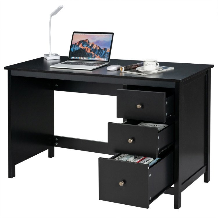 Made of durable MDF; the computer desk is sturdy and reliable for a long service time. Coming with 3 large drawers; it provides enough storage space for computers; books; and other office supplies. Also; the office desk is designed with a spacious tabletop to ensure optimal workspace and keep your daily essentials in order. With a simple but elegant design; it is a perfect complement to your house and office. Besides; it is an ideal choice whether you need a spot to study; dress up or finish important work!