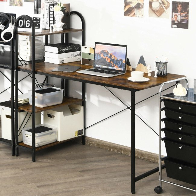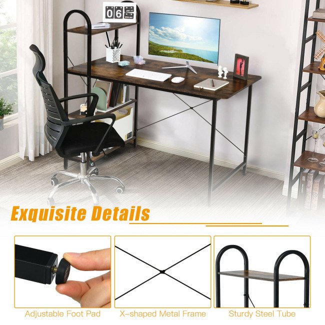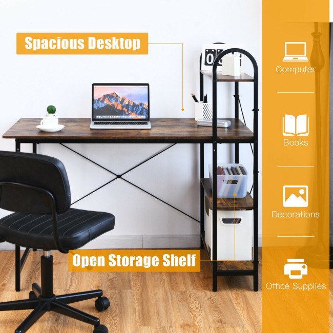 Designed with the metal construction, the computer desk is excellent in sturdiness, which shows in the overall weight capacity up to 198 lbs. The dimension of the desktop is 23.5" x 48", which is spacious enough for a common computer and other items. On the side, there is a 4-tier open shelf where you can store many office supplies. As the shelf is reversible, you can freely place it in the right and left corners. Therefore, it is very suitable for small rooms.