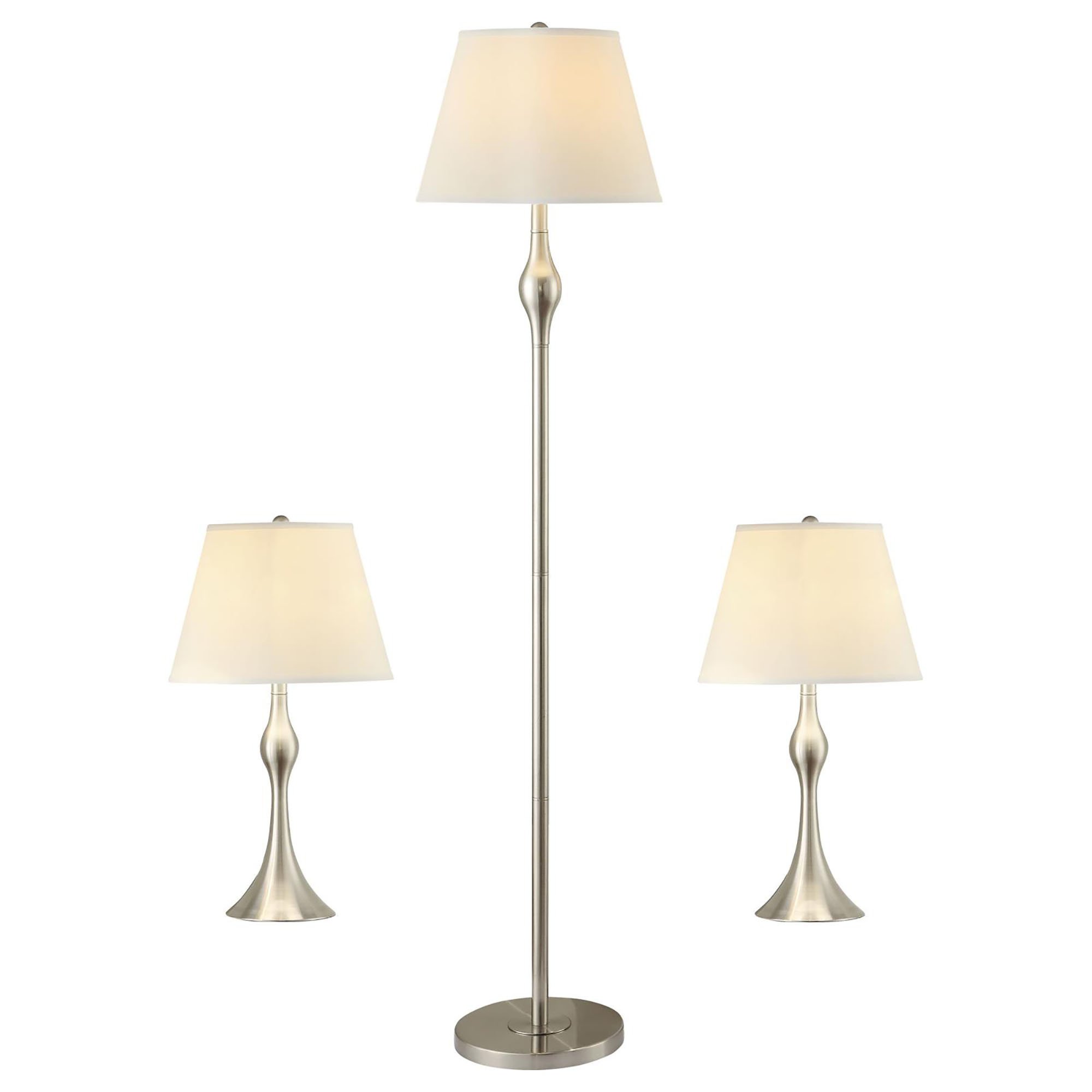 Romance CopyGraceful and sleek, this transitional lamp features a brushed nickel finish and a beige faux silk empire shade. Perfect for placing beside a sofa or on a desk in a home office, this lamp creates a soothing glowProduct DetailsSet includesOne (1) floor lamp and two (2) table lampsFloor lamp dimensions60 inches high x 14 inches wide x 14 inches deepTable lamp dimensions25 inches high x 14 inches wide x 14 inches deepFabric ColorBeigeFinish ColorBrushed NickelMaterialsMetal and faux silkShade colorFaux silk empire shadeBulb type9WSwitch type2-waySocketE26