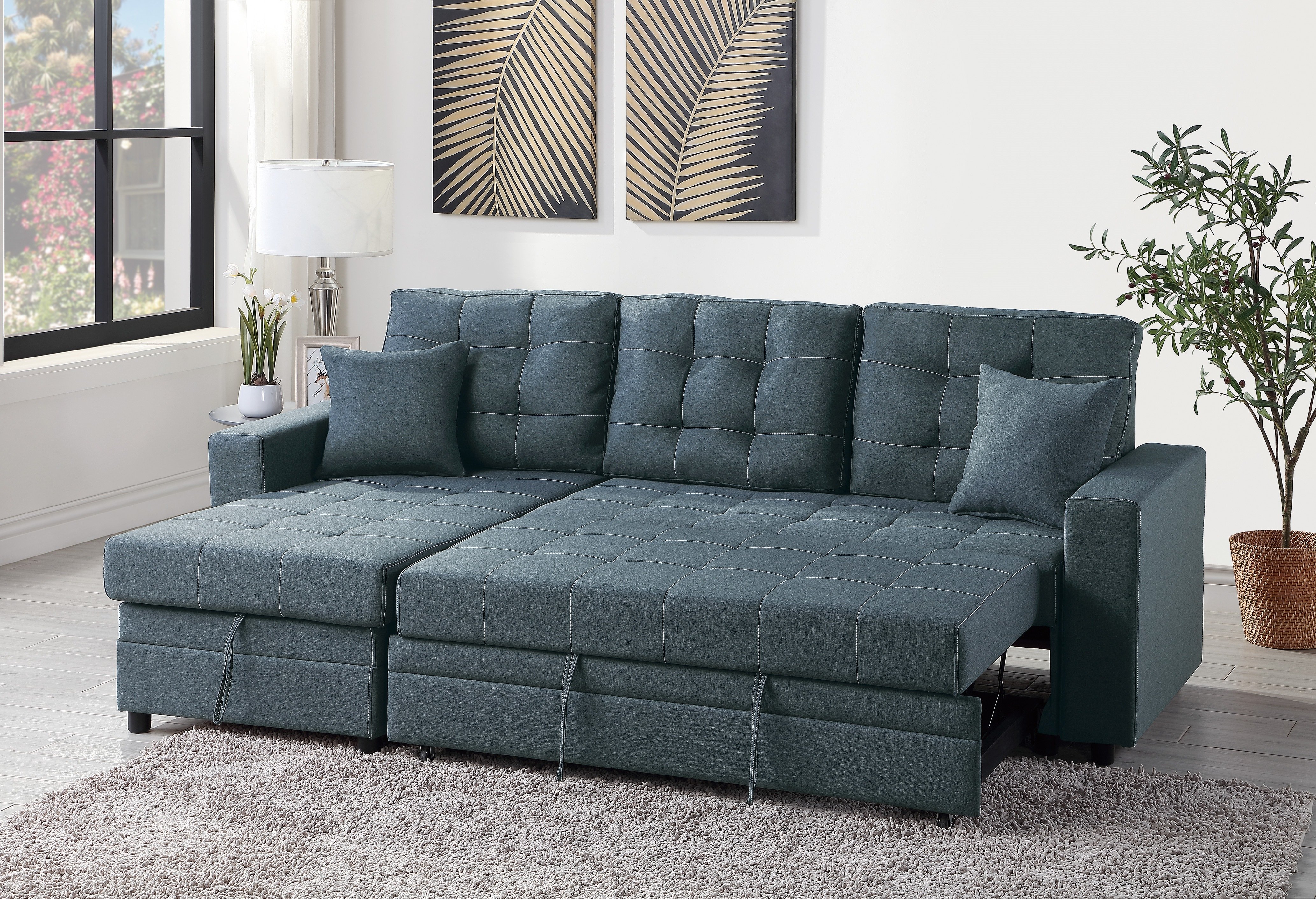 Product Features:-•Contemporary Style•Blue Gray•Tufted Upholstered•Button Tufted Back And Seats•Track Arms•Pillows•Polyfiber (Linen Like Fabric)•Solid Pine Wood•Plywood, Foam, S Spring•Pull out Bed•Reversible Chaise w Storage