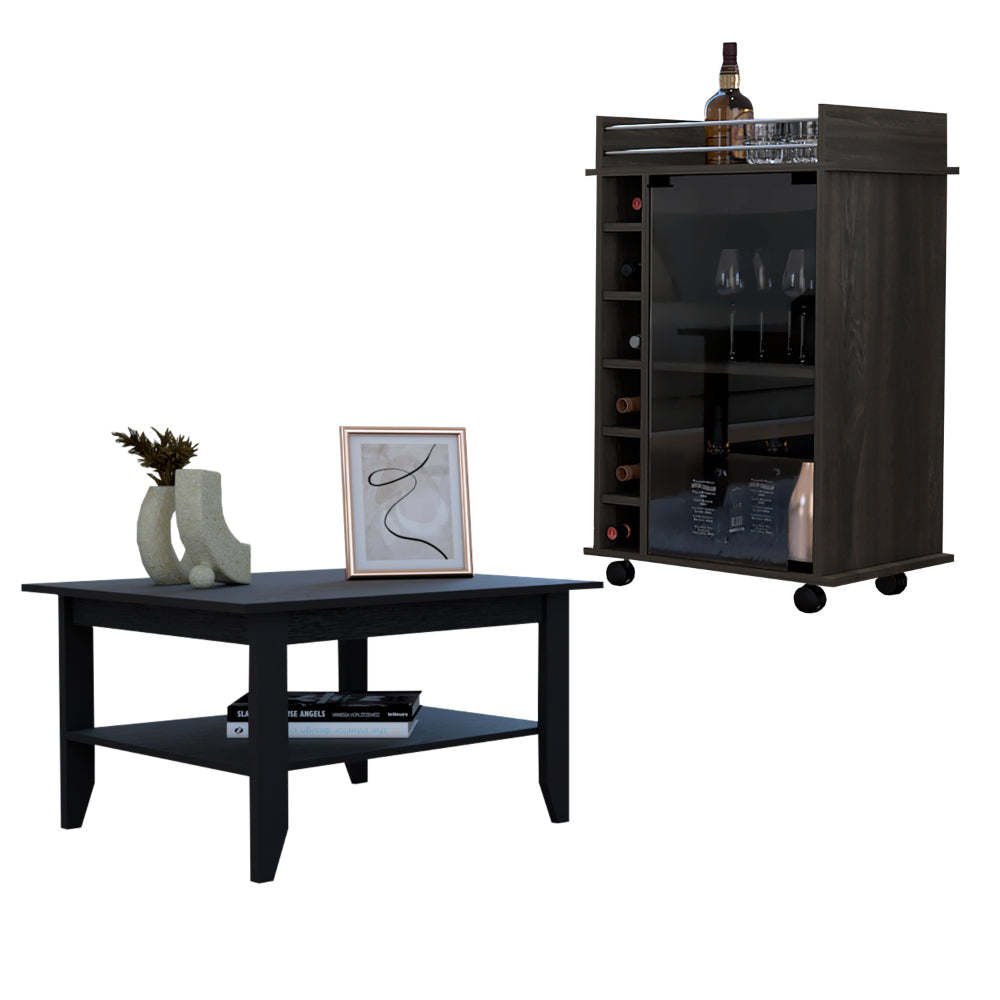 Romance CopyIntroducing the Cabrillo Living Room Set - a beautifully designed and modern set that will add a unique touch to your living room. With its sleek design and stylish appeal, the Cabrillo Living Room Set is perfect for any discerning homeowner who wants to add a touch of class and sophistication to their home. This set includes everything you need to have the living room you always dreamed of, including an exclusive manufactured wood in elegant black and espresso color. The Coffee Table is perfect for displaying all your favorite decorations. Its wide surface provides ample space for everything from vases and flowers to books and magazines. The Coffee Table is also sturdy and weather-resistant, making it ideal for use in any outdoor setting. Completed set with the incredible bar cabinet comes with six compartments for wine bottles (4.4"H X 3.7"W), and two interior shelves for your liquors of choice (13.5"H X 14,1"W).Product DetailsSet includesOne (1) coffee table and one (1) bar cabinetFinish colorBlack, EspressoMaterialsManufactured woodCoffee table dimensions17.72"H x 31.5"W x 27.56"DBar cart dimensions35"H x 21.6"W x 16.3"DBottles capacity6Number of shelves4