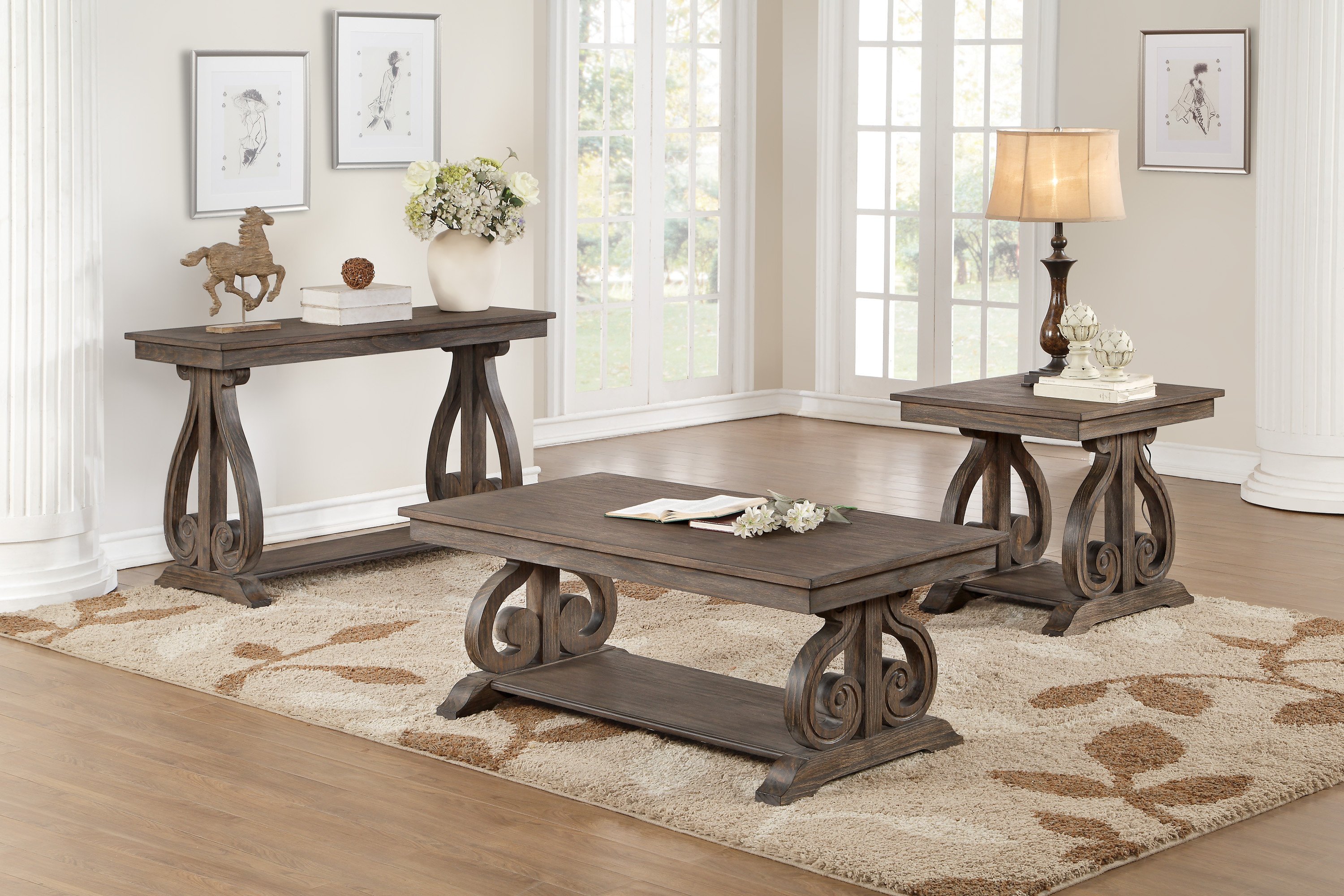 Description & DimensionsBold curves provide elegant contrast to the unique look of the Toulon Collection. The heavily scrolled base supports of the tables feature French provincial inspired routing while distressed dark oak finish provides texture to the acacia veneer of this elegant occasional collection.PRODUCT DIMENSIONS: Overall Dimension: 24" x 26" x 24"HShelf interior: 12.75" x 15.75" x 17.75" (1)Listing Includes: One End Table Only.Sofa Table and Coffee Table: Not included.Simple Assembly Require.