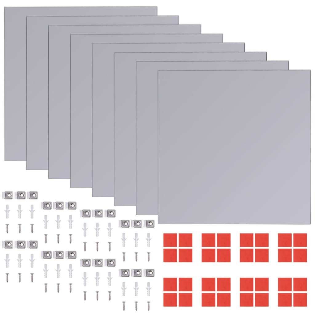 You can hang these mirror tiles directly on the wall with the included stainless steel hangers, or stick them to the wall by using the stickers. Delivery also includes mounting screws.Material: High-quality glassMirror size: 8.1" x 8.1" (L x W)Mirror thickness: 0.16"Frameless designDelivery includes:8 x Mirror tile24 x Screw24 x Stainless steel hanger32 x Sticker