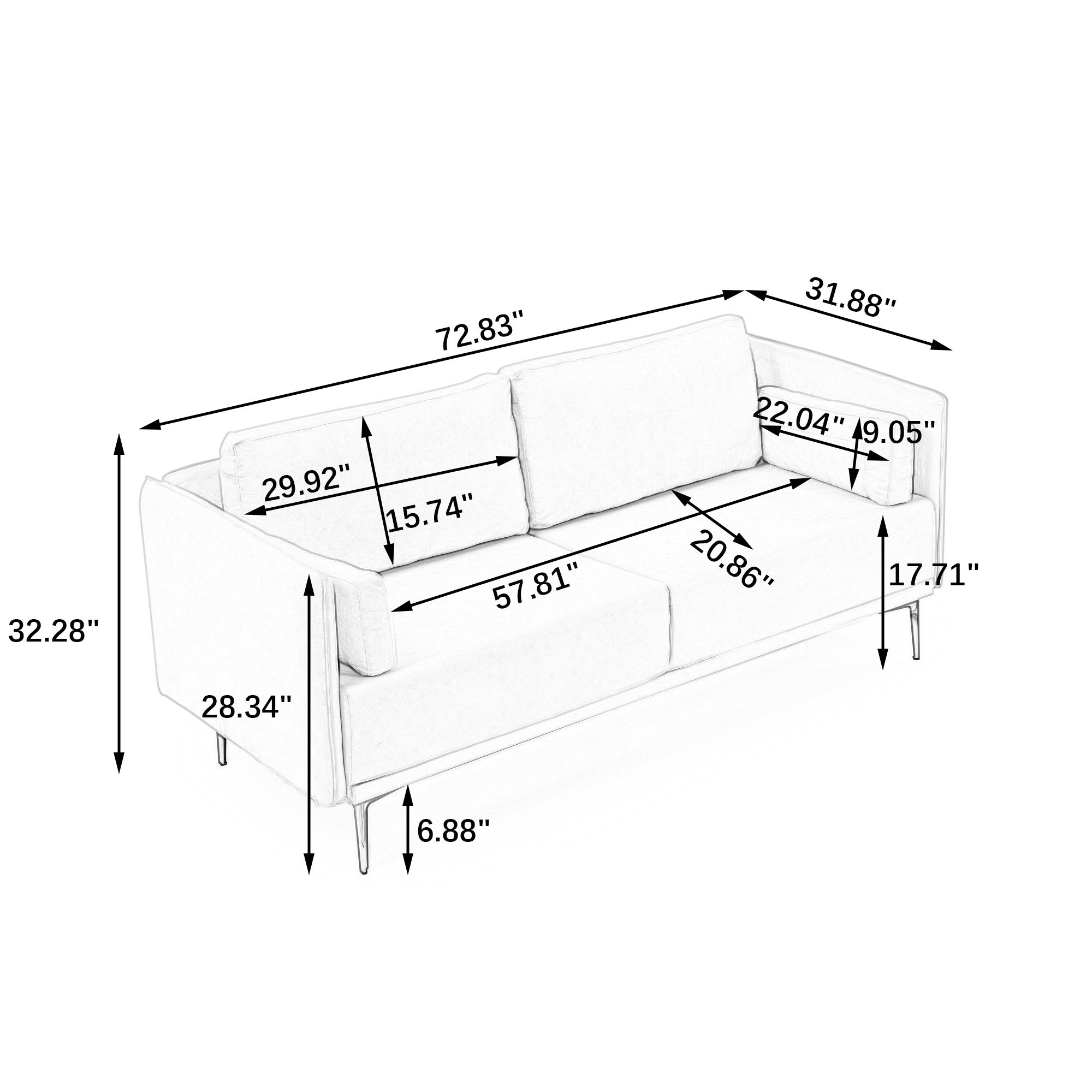 Dimensions & WeightDimensionSize: 72.83'' W x 31.88'' D x 32.28'' HDetail DimensionPlease refer to the image.Overall weight79LbsWeight Capacity750LbsMaterialUpholstery: LinenLegs: MetalFrame:Eucalyptus and plywoodSeat Fill: FoamSeat ConstructionFrame: Sinuous SpringsRemovable CoverNoRemovable CushionYesAssembly Required30 minsPackage Number1