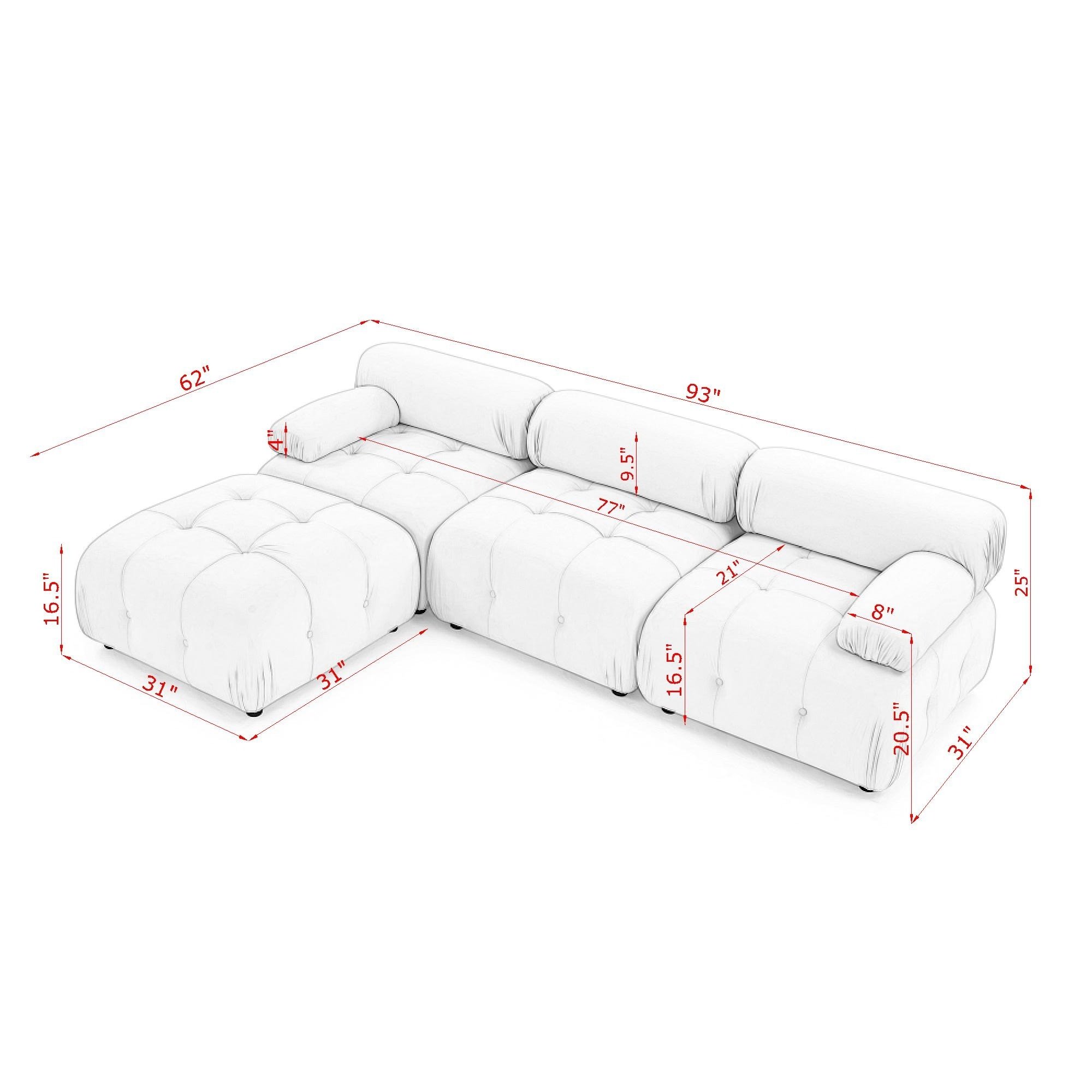 Weight & DimensionsOverall Product DimensionOverall Dimension:93"x62"x25" Single Chair Size:31"x31"x25" Ottoman Size:31"x31"x16.5"Number of Package4Overall Weight150lbsWeight Capacity250lbs/seat (1000Lbs for this modular)MaterialUpholstery:Velvet Frame: Eucalyptus wood+Plywood Seat Fill:Foam 1.6 lbs./cu. ft. Legs: Plastic 1inchSeat ConstructionSinuous Spring+SpongeRemovable CoverNoRemovable CushionNoAssembly RequiredYes 1HourAdditional Tools RequiredAll Tools Included