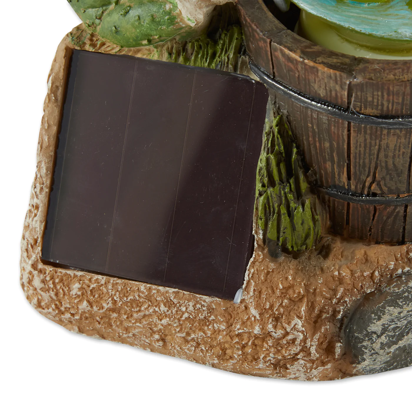 • This statue features three smiling frogs standing tall on a garden shovel, while a little frog takes a dip in a rain barrel. The little frog rotates and lights up at night with help from the sun's power by day.