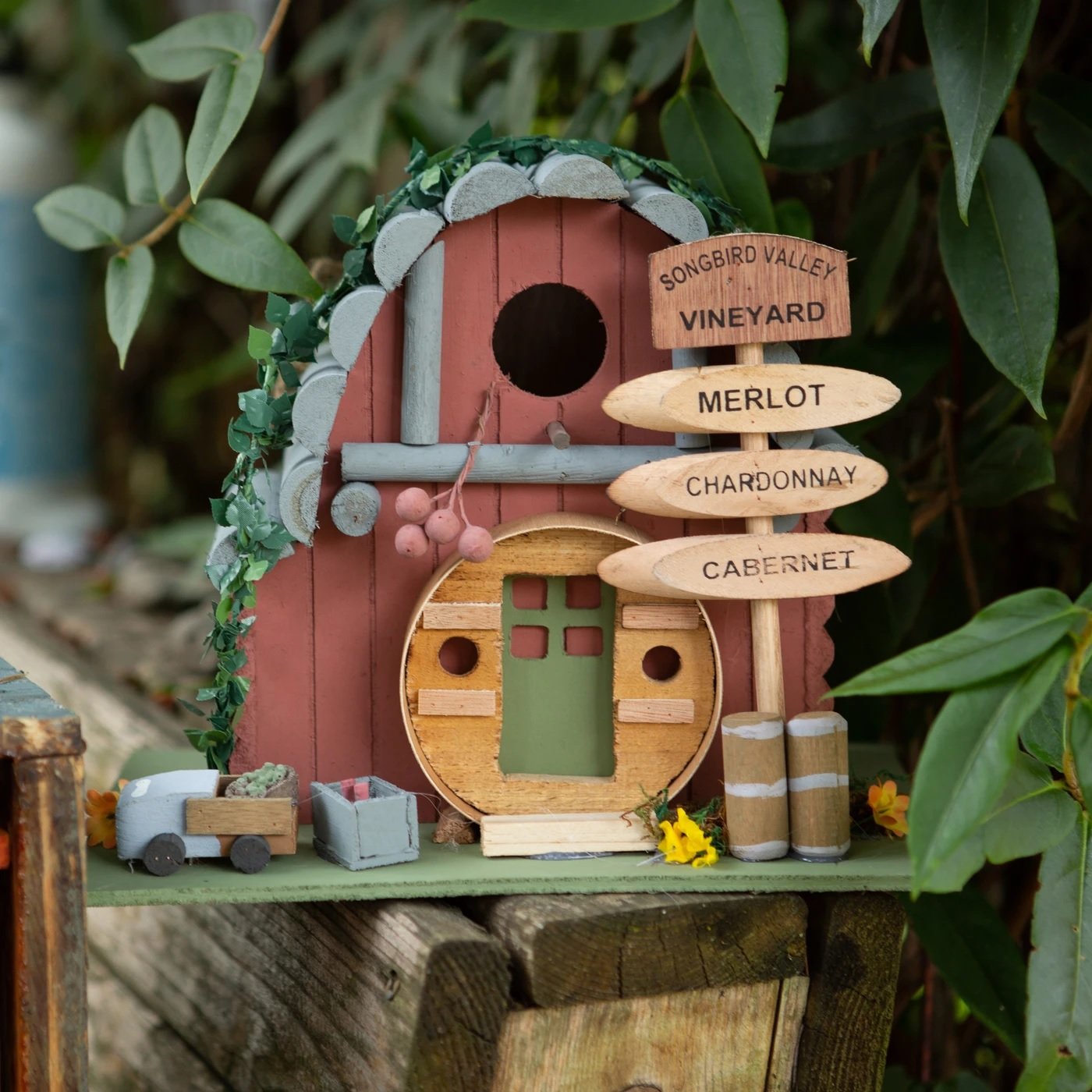 • Songbird Valley Vineyard is a rustic hotspot for birds of good taste and is adored with grape wines, barrels, and slatted roof. Inspired by a vintage winery, this birdhouse offers merlot, chardonnay, and cabernet as options for its feathered guests