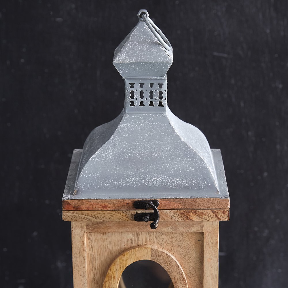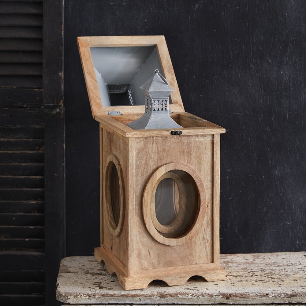 Inspired by oxeye windows, our set of lanterns is an impressive, elegant touch to a room. Each feature traditional elements from early English architecture. Lanterns are created of wood and metal and feature a hinged access door. Smallest lantern measures 7''W x 7''D x 18''H.