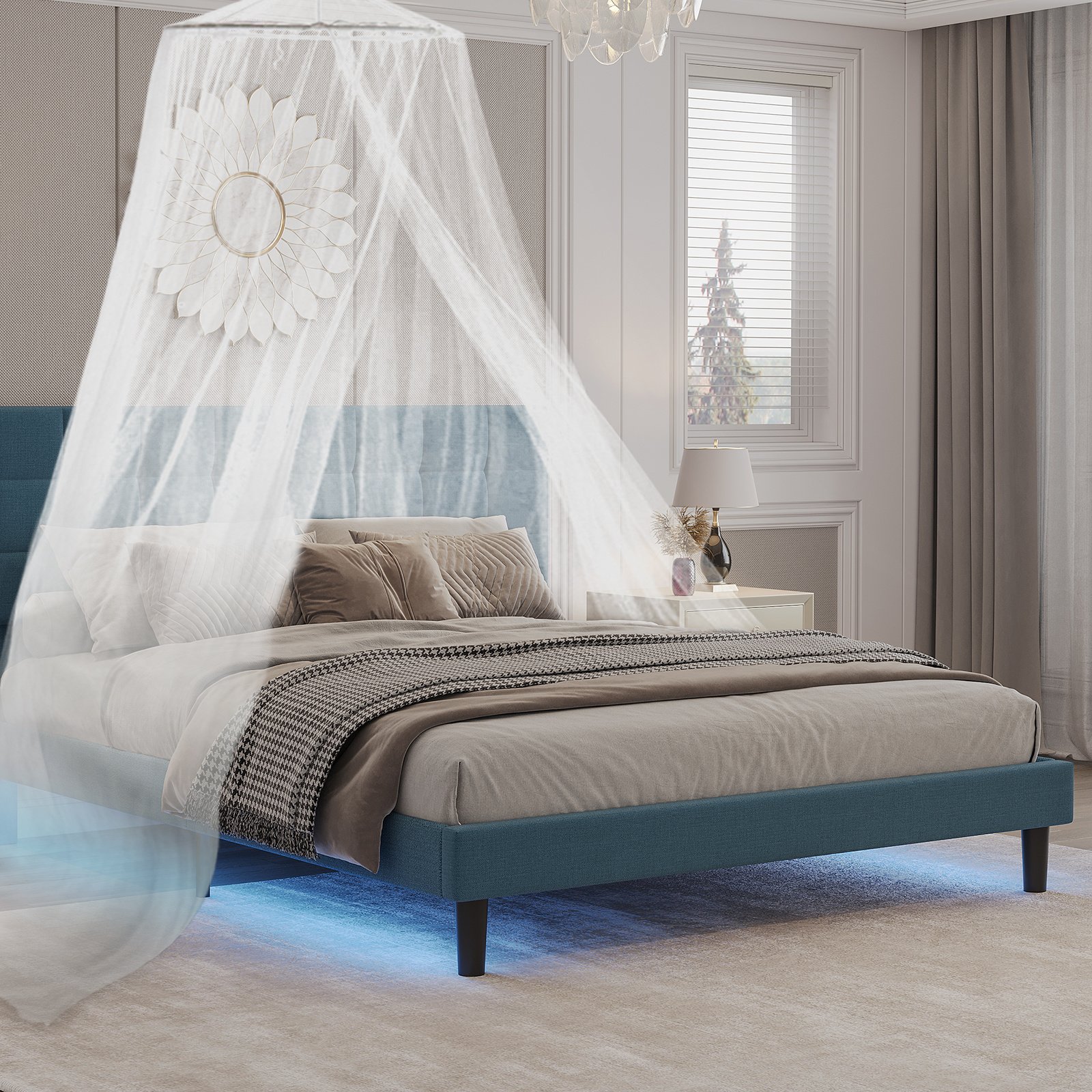 Queen Size Upholstered Platform Bed Linen Bed Frame with Lights Square Stitched Adjustable Headboard Strong Bed Slats System No Box Spring Needed Blue