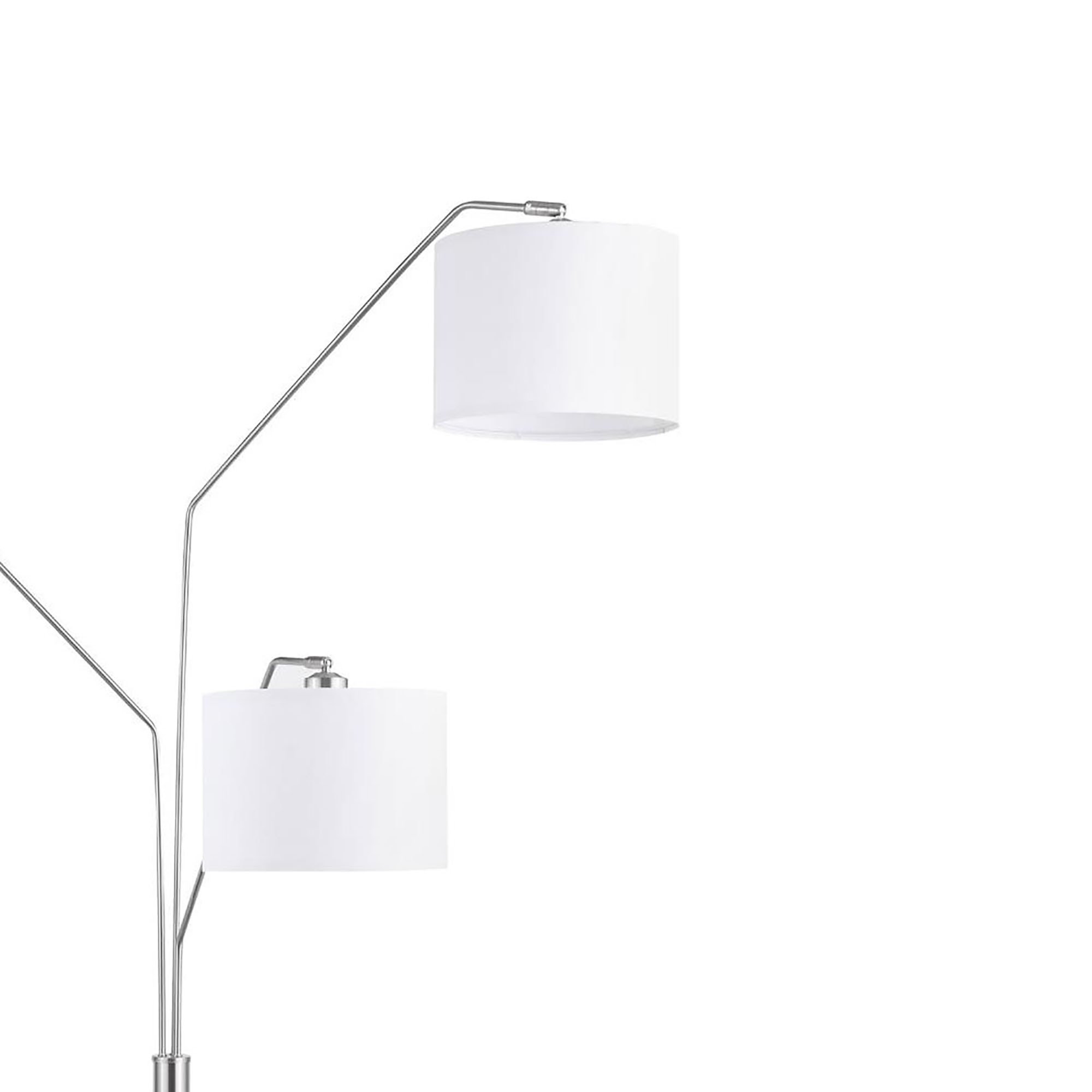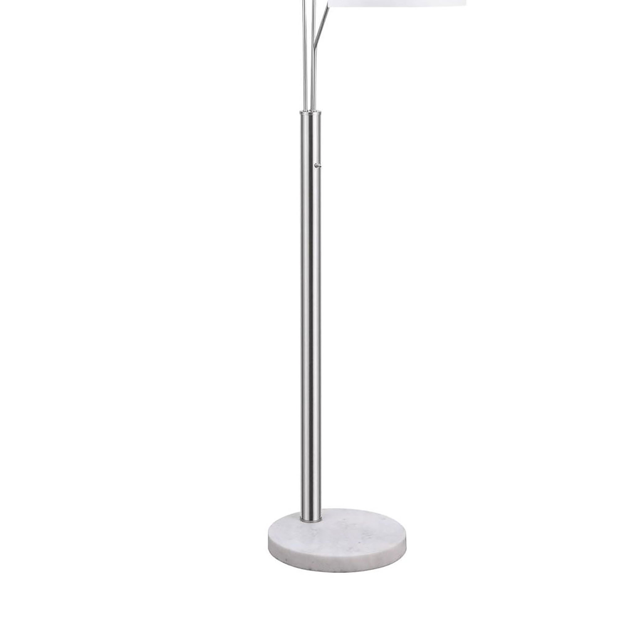 Romance CopyInstantly brighten your space with this modern and sleek floor lamp. Its three-tier design offers plenty of lighting that's enclosed with drum style lampshades, while this piece is supported on a durable and attractive marble base.Product DetailsSet includesOne (1) floor lampFloor lamp dimensions83.5 inches high x 56 inches wide x 13 inches deepFabric colorWhiteFinish colorStain NickelMaterialsMetal, fabric and marbleSwitch typeDimmerBulb type9WSocketE26Cleaning codeS